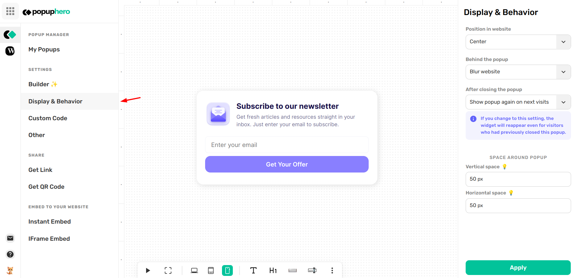 Once you’ve finished designing your popup, the next step is deciding exactly where it sits on your website and how it should behave when a visitor interacts with it. You can manage all of these details in the Display & Behavior tab.